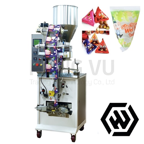 Máy đóng gói túi tam giác là thiết bị dùng để đóng gói bánh, kẹo, bimbim, đậu phộng, bánh dừa, kẹo socola, kẹo bi, tỏi đen… vào túi bao bì dạng hình tháp tam giác. Máy thuộc dòng máy đóng gói dạng hạt. Máy đóng gói tam giác sử dụng bộ cặp ben khí giúp tạo hình túi tam giác vì vậy yêu cầu khách hàng phải trang bị thêm nguồn khí.